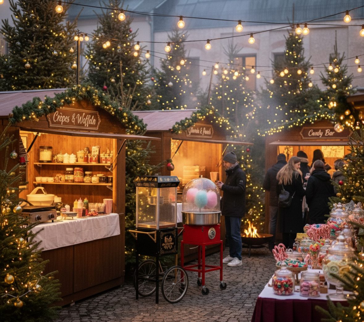 Wir bieten Ihnen das perfekte Ausstattungsequipment für Ihre Weihnachtsfeier oder Ihren eigenen Weihnachtsmarkt an. Egal, ob Sie eine bezaubernde Candybar, eine knusprige Popcornmaschine, eine süße Zuckerwattenmaschine, einen professionellen Crêpes-Maker, ein Gastro-Waffeleisen, verschiedene Glühweinkocher & Punschkocher oder praktische Warmhaltevitrinen und Warmhalteplatten benötigen – wir haben alles, was Sie für ein unvergessliches Fest brauchen!